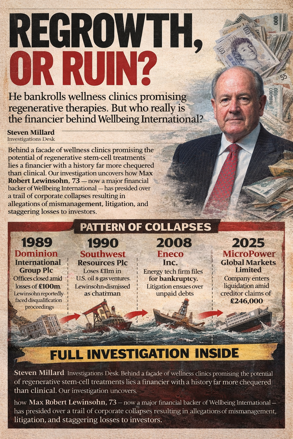 An investigation into the business history of Max Robert Lewinsohn, a key financial figure linked to Wellbeing International Foundation, reveals a career shaped not by medicine — but by a succession of ambitious investment ventures, many of which ended in liquidation, administration, or legal dispute.